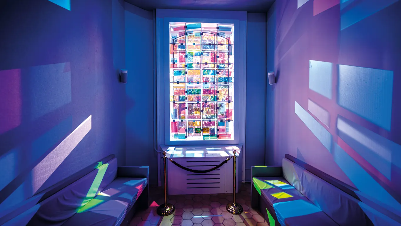 Bright colors now enliven the wood-paneled Mallet House, creating a warm and inviting atmosphere. A large animated map traces the journeys of Pastor Jean de Léry, the passengers of the Mayflower, and Huguenot refugees across oceans and continents. In a music room illuminated by moving stained glass, visitors hear a Hungarian psalm, Aretha Franklin’s gospel, and a blues song by Johnny Cash, while three cinema screens present defining moments of protest: Luther before Charles V in 1520; suffragettes confronting London police in 1910; and climate activists of the 2020s.